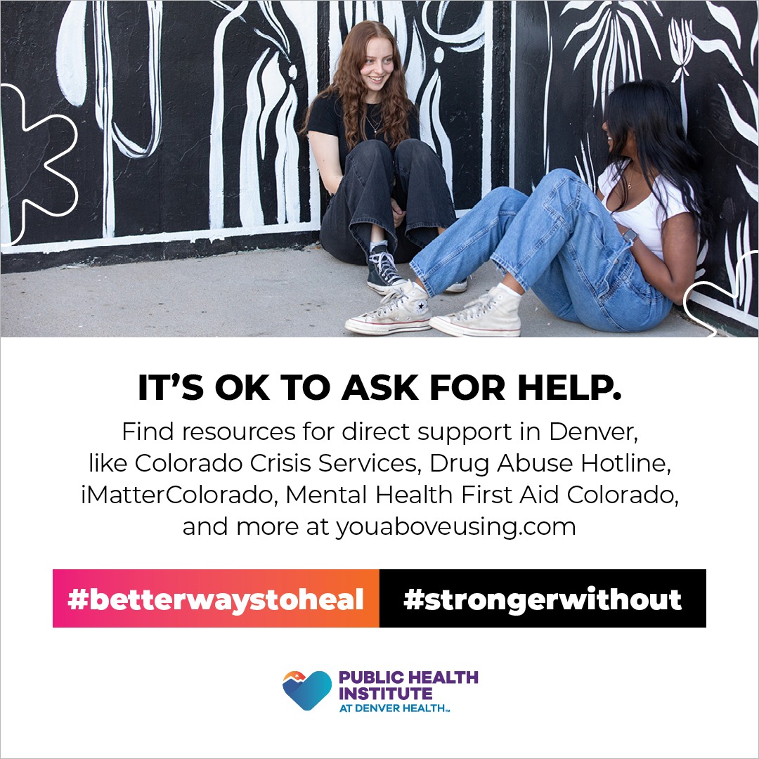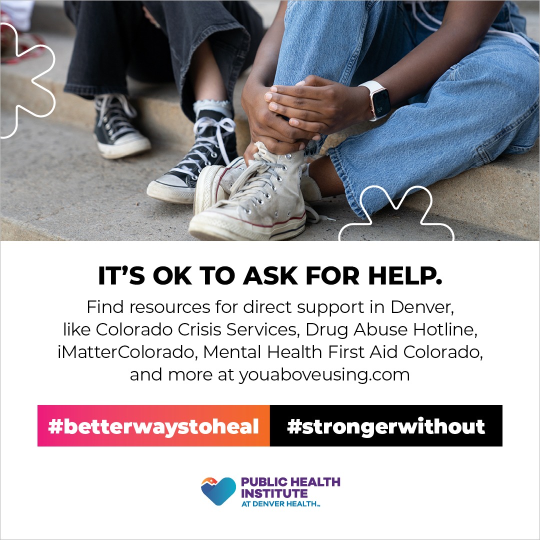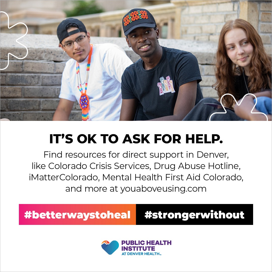 It’s ok to ask for help. That’s why we’ve gathered resources for you to find direct support in Denver, like Colorado Crisis Services, Drug Abuse Hotline, iMatterColorado, Mental Health First Aid Colorado, and more. Remember, there are #betterwaystoheal by putting you above using. Learn more on our website – link in bio! #strongerwithout